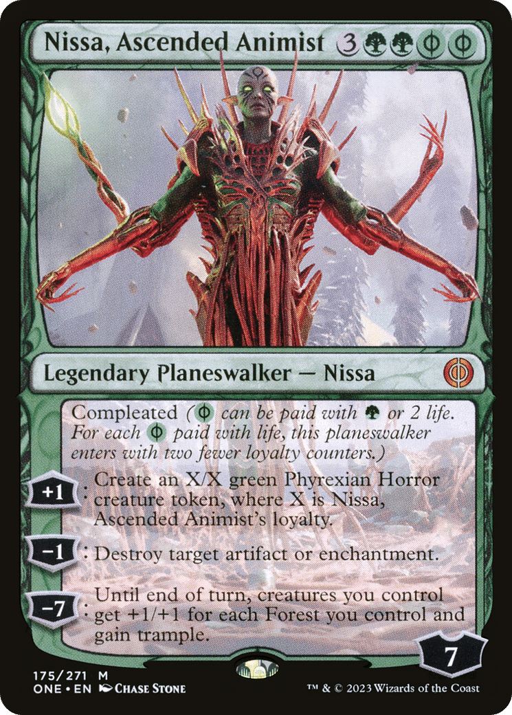 +1: Create an X/X green Phyrexian Horror creature token, where X is Nissa, Ascended Animist’s loyalty.